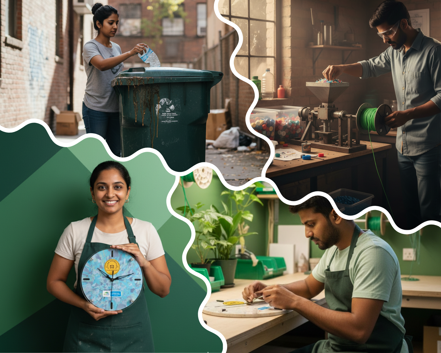 Shop gifts, trophies, décor, and essentials made from recycled plastic — created by local artisans and women-led micro-units.